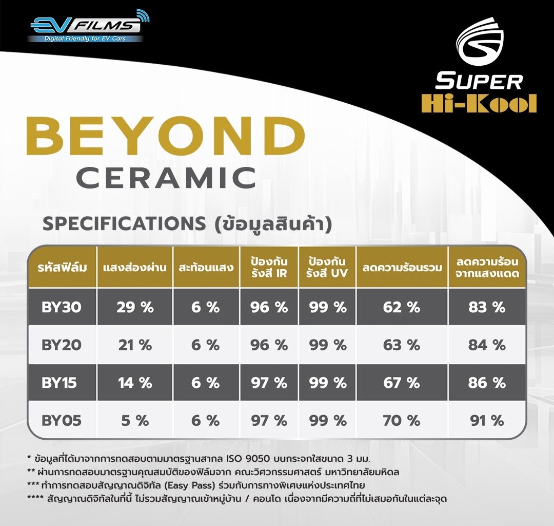 ยกระดับนวัตกรรมฟิล์มกรองแสงไปอีกขั้นด้วยฟิล์ม Super Hi-Kool® Beyond Ceramic Series โดยการผสาน Nano Ceramic สารป้องกัน UV และ IR เข้าเป็นเนื้อเดียวกันกับเนื้อฟิล์ม ทำให้ได้ฟิล์มกรองแสงที่มีคุณสมบัติทนทานกว่า อายุการใช้งานยาวนานกว่า และกันความร้อนได้สูงขึ้น จึงเย็นกว่าด้วยการป้องกันรังสีอินฟราเรด Infrared Rejected (IR) สูงถึง 97%